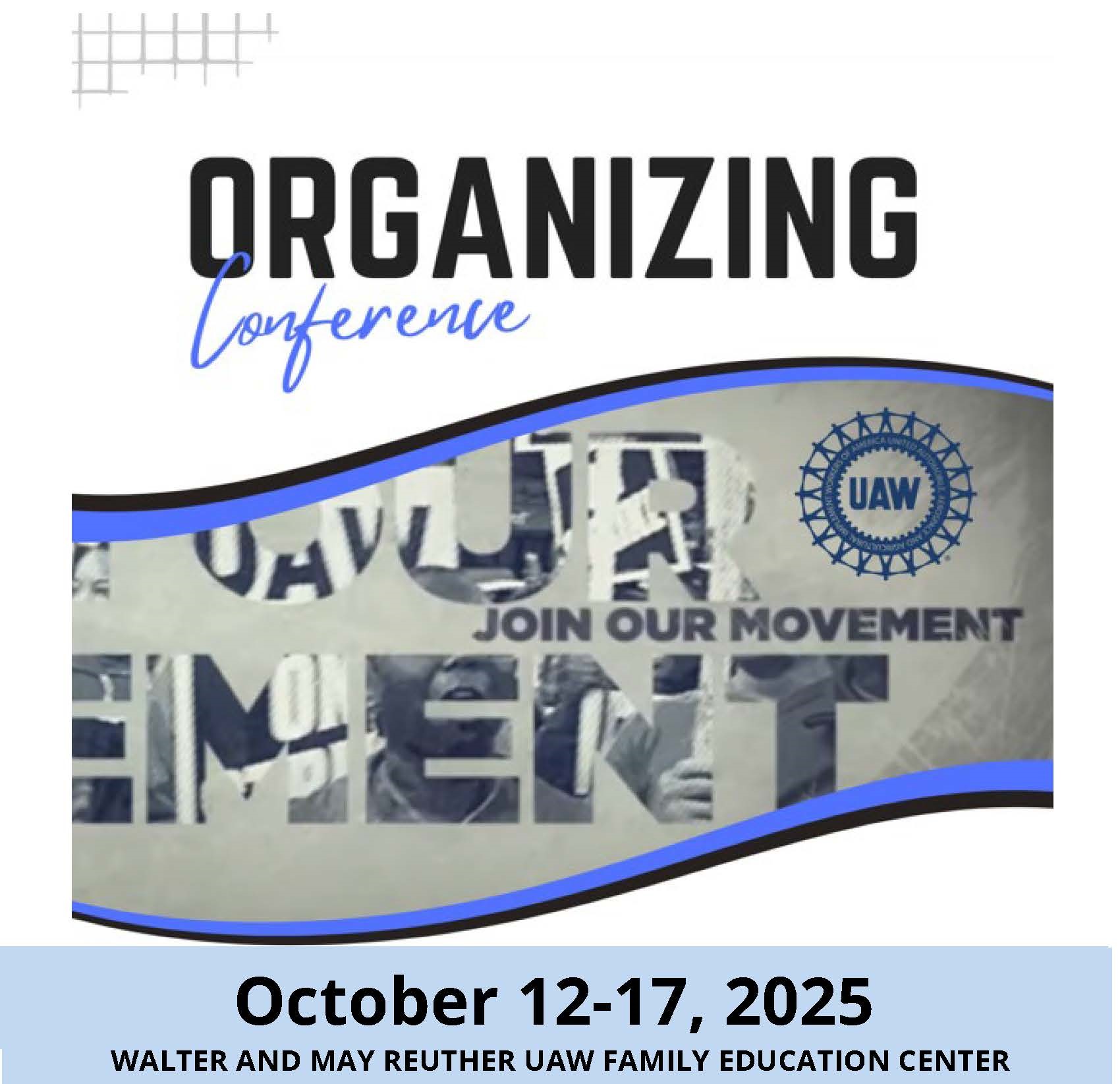 In conjunction with the UAW Organizing Department, the Education Department will hold an Organizing Conference from October 12-17, 2025, at the Walter and May Reuther UAW Family Education Center in Onaway, Michigan. See the call letter for details.